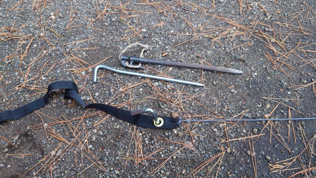 まずは付属のスチールペグを使ってみることにします。ガイドを使って六カ所に打ち込んでいきます。地面が固いところは鍛造ペグを使いました。