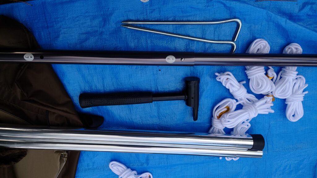 スチールペグが16本にガイロープが16本、アルミ製のセンターポールが1本になかなか立派な鉄製のハンマーが付属します。