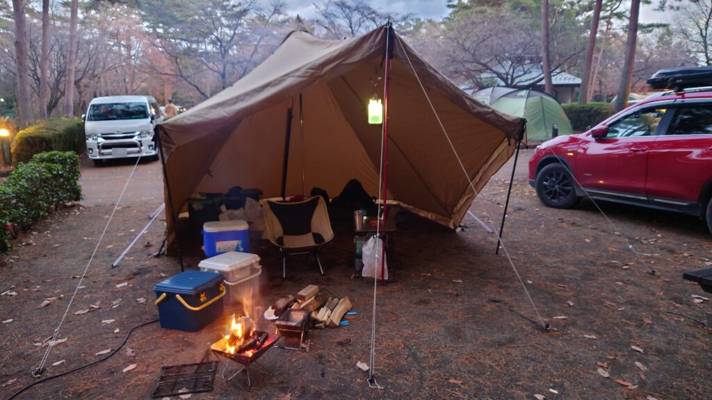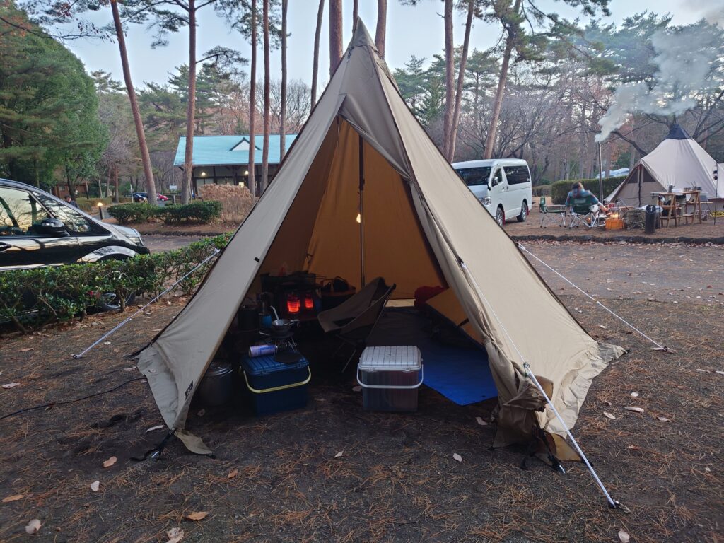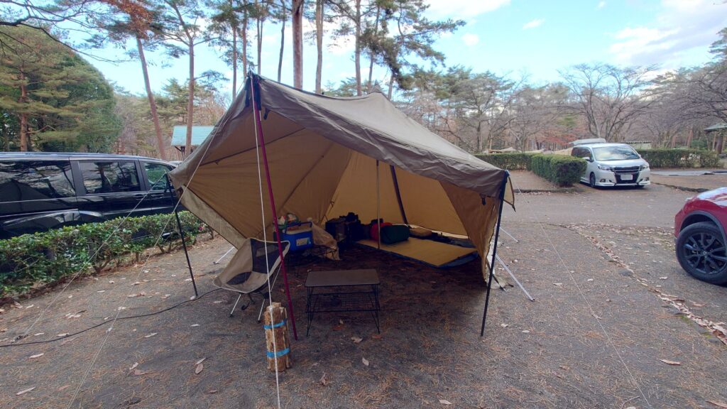 今回は、初めて張るテントのために区画サイトを利用したくて空きを探していたのですが、温泉・電源付きの那須野が原が利用できたのは幸いでした。ワンポールテントの購入に当たり検討したのが、tent-Mark DESIGNSのサーカスTCと小川のタッソT/Cだったのですが、広さが変えられる事とテントの一部を張り出しタープ代わりにできるところに惹かれタッソT/Cにしました。今回六角形で利用していいと感じたのは、ソロにちょうどいい大きさだということと、前面を張り出すとタープ無しでも十分なリビングスペースが確保できると言うことです。残念に感じたのは、スカートの部分の巻き上げが想像と違ったことと、張り出した部分を収納してテントを閉じる時そのままではファスナーに手が届かないと言うことです。とにかくいろいろな張り方が楽しめるので他の張り方も試して行きたいと思います。