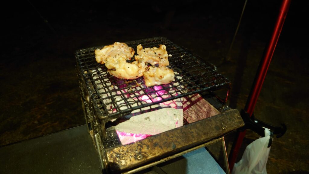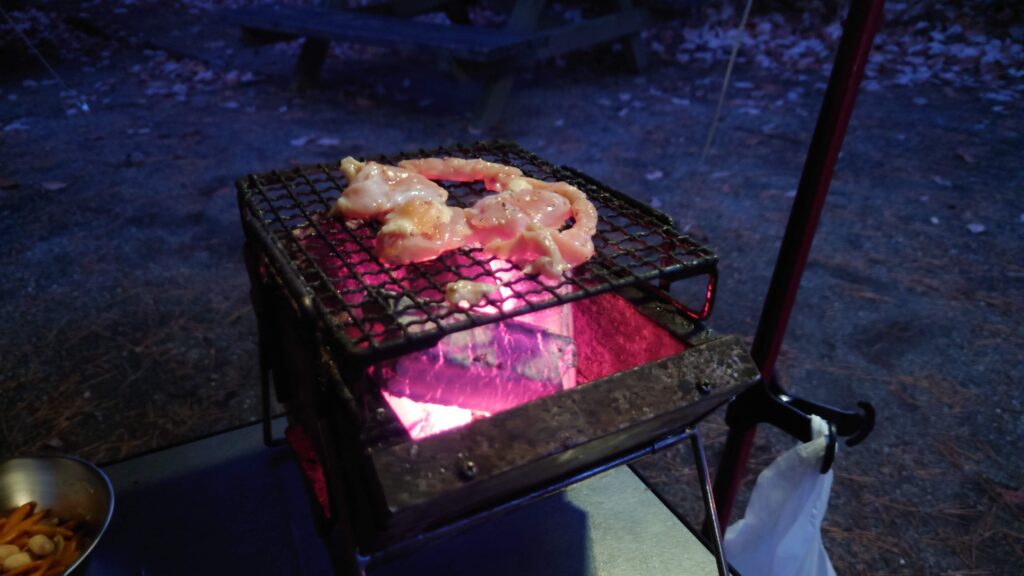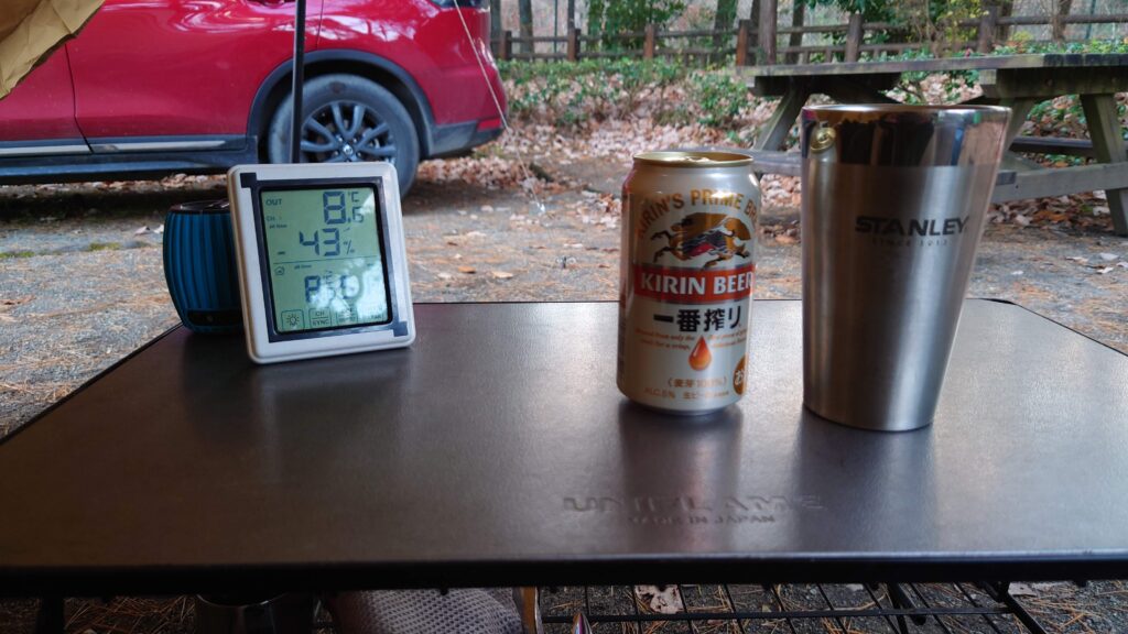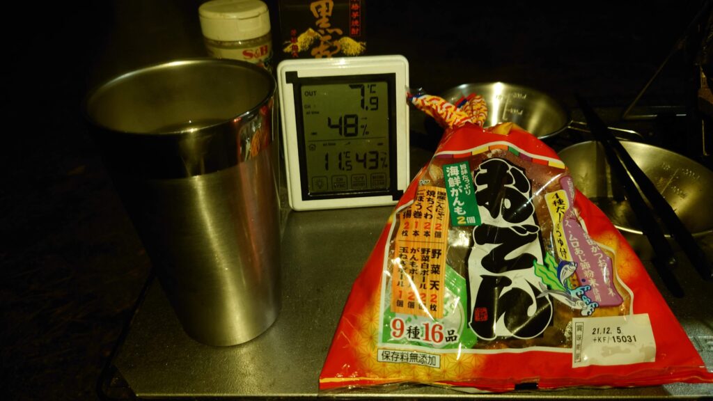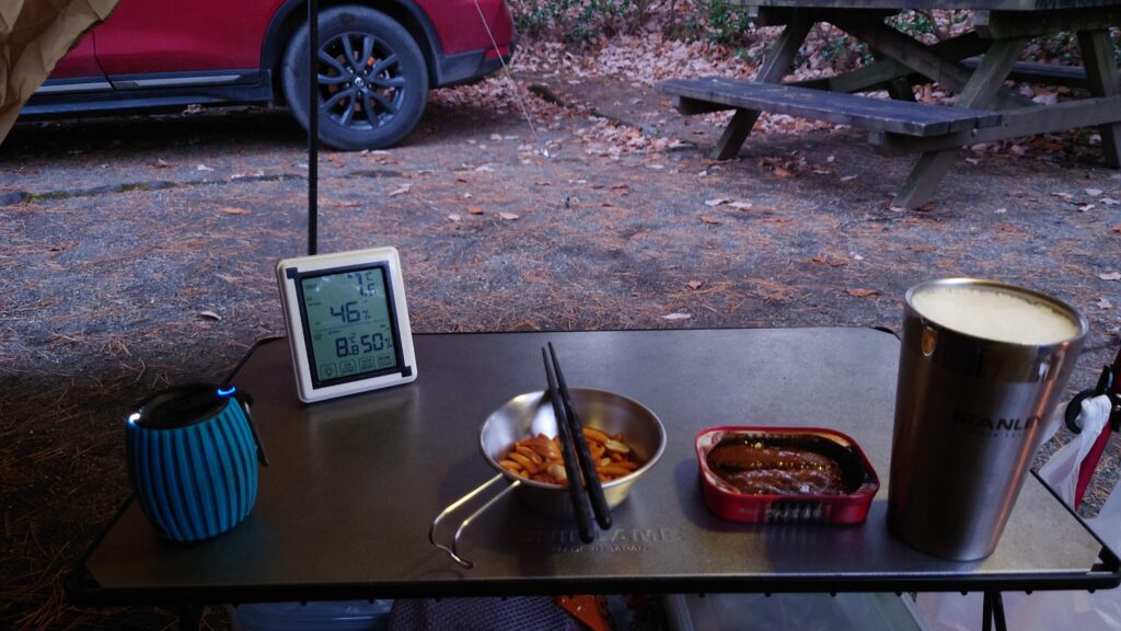風呂から上がりテント内のレイアウトをいじっていたら4時を回ってしまいました。この季節はすぐに暗くなってしまうのでさっさと始めることにします。この時の気温は8.6℃です。