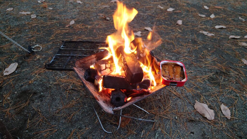 火が付いたところで、形成備長炭を投入し、ストックしてあったサンマの蒲焼きの缶詰を温めます。