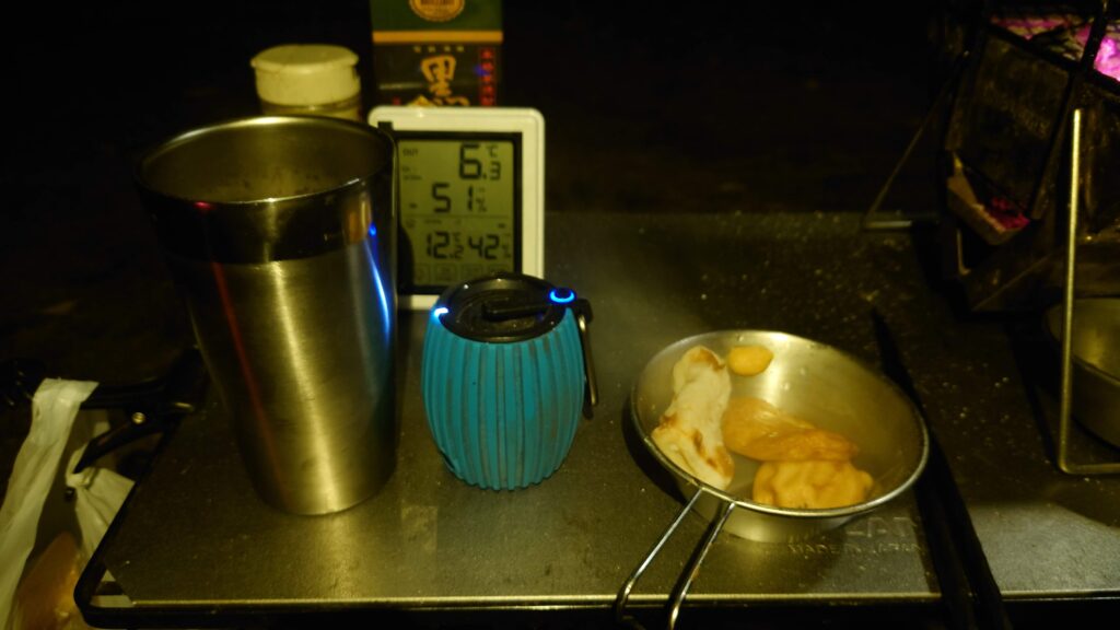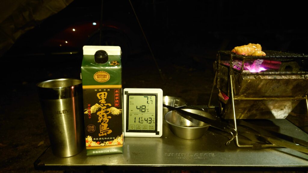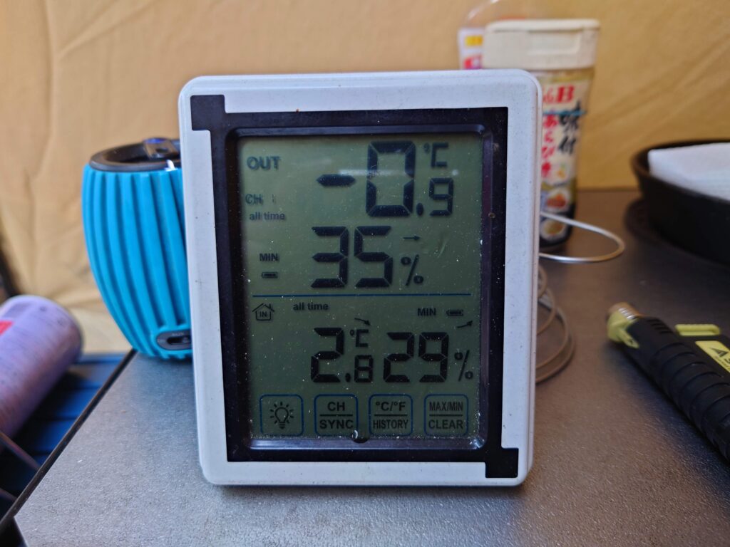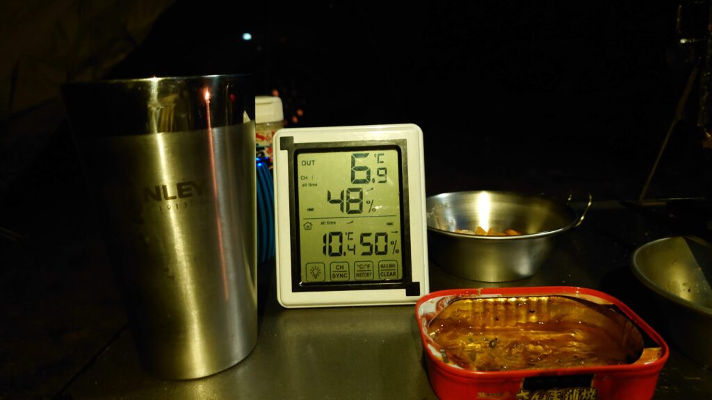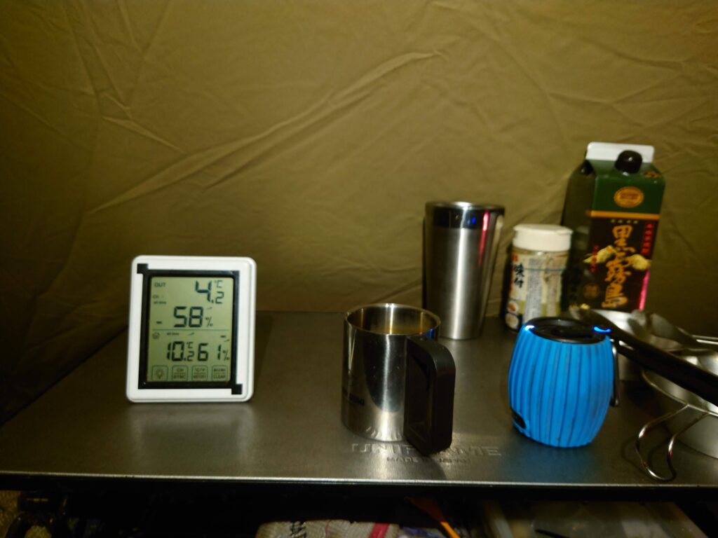 気温も7℃を下回りましたが、テント入り口の焚き火のせいか、近くの炭火コンロのせいか(^^;)幕の下は3℃以上高めです。
