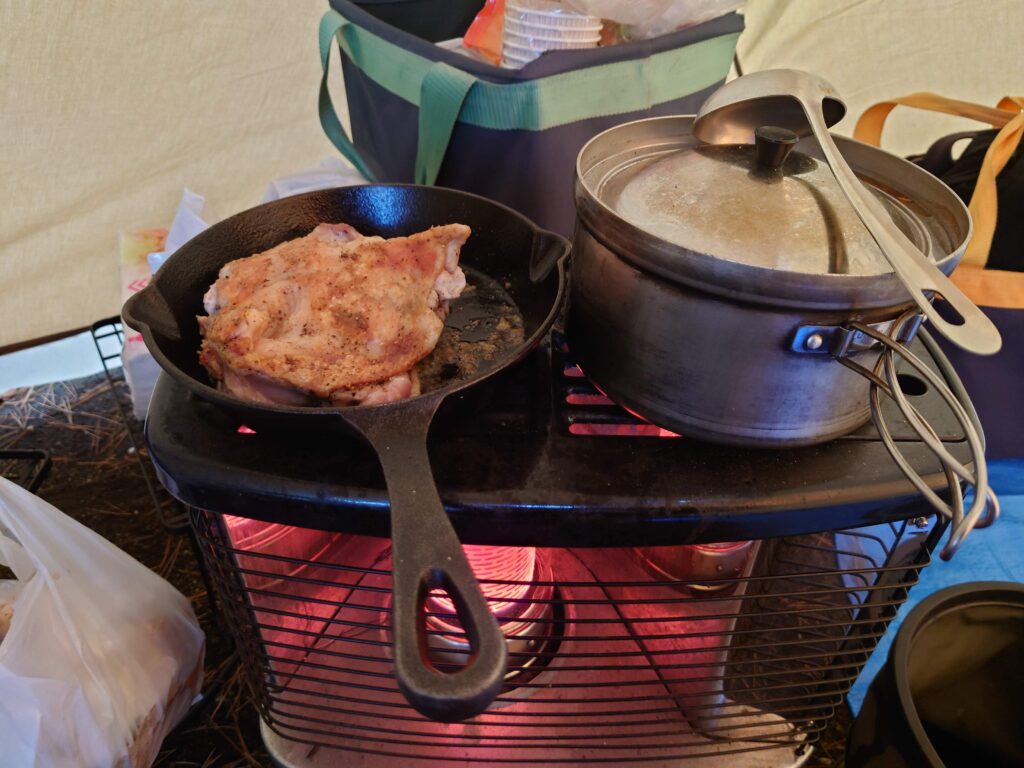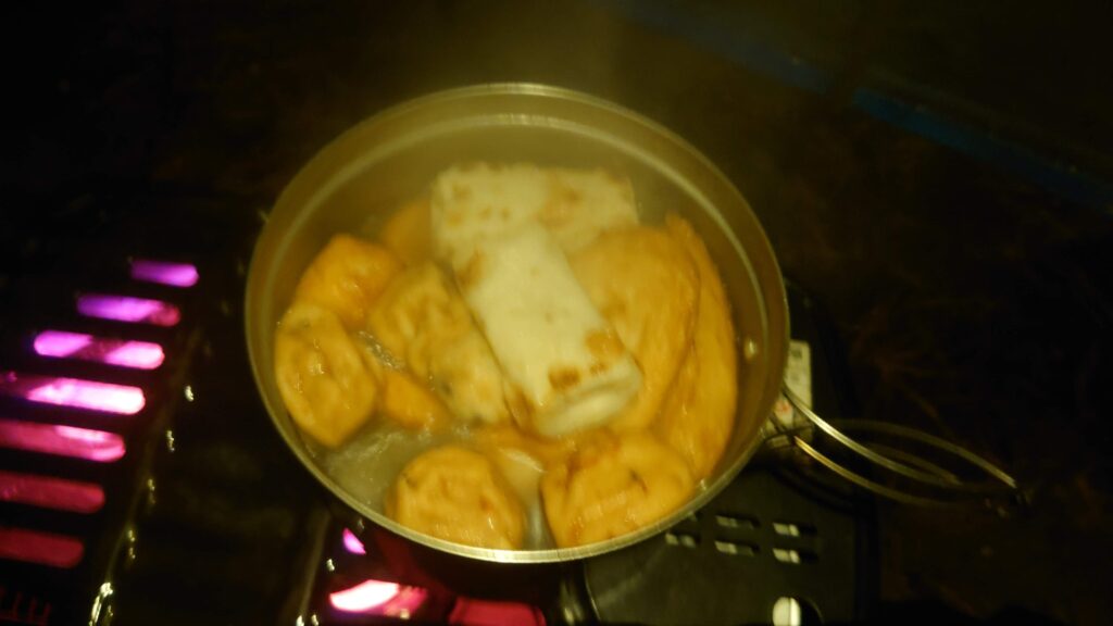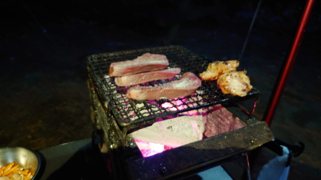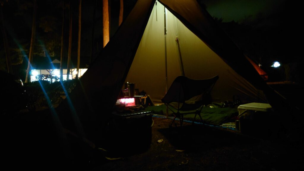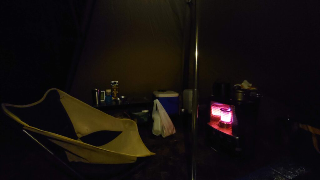 気温も7℃を下回りましたが、テント入り口の焚き火のせいか、近くの炭火コンロのせいか(^^;)幕の下は3℃以上高めです。