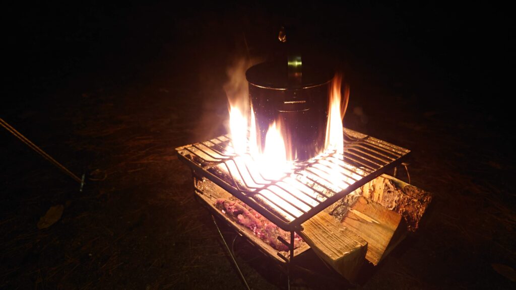 持ってきた手持ちの薪をたき付けに焚き火を始めます。
