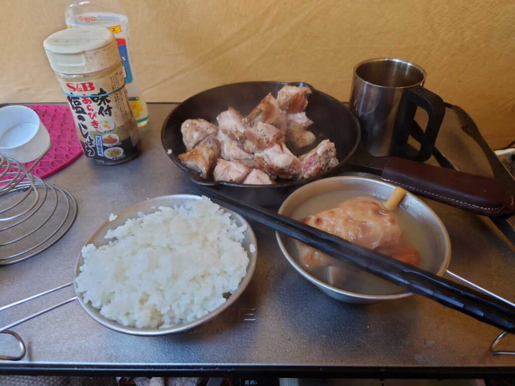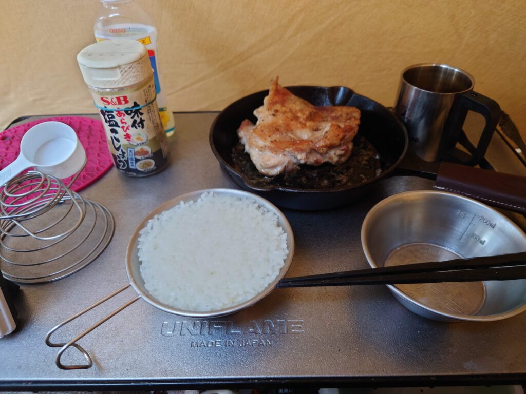 朝食はいつものシェラカップ炊飯