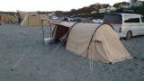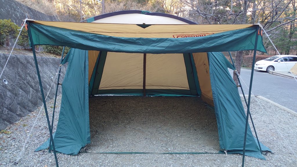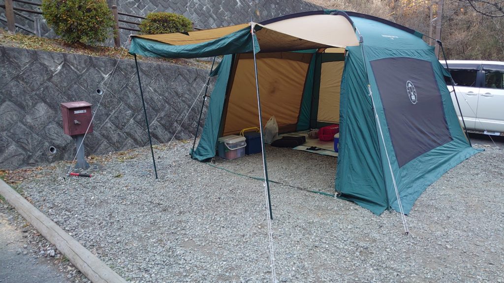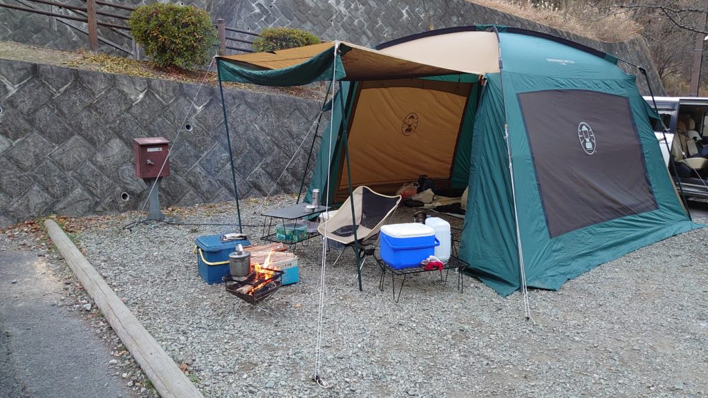 大分年季の入ったスクリーンタープですが、前回のだいや川公園に続きこちらを使います。ツーリングドームのポールは入荷したのですが、オープンタープでのたき火では少ししんどそうなので、スクリーンタープで一泊することにしました。