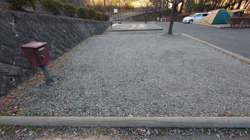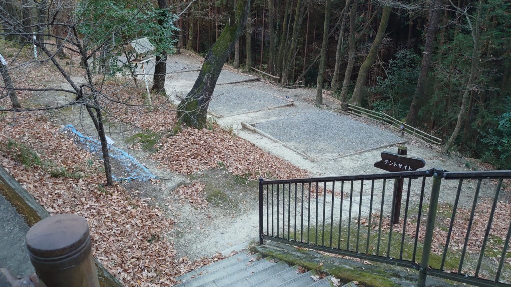 オートでは無いサイトはエリアが2カ所に分かれていて、先ほど紹介したサイトは管理棟から降りてすぐのところですが、こちらのテントサイトは管理棟からかなり下ります。荷物運びは、すぐ外を走る公道からになります。駐車場は少し離れるので、大きな荷物があると苦労しそうです。リアカーやキャリーワゴンなども使えそうにありません。