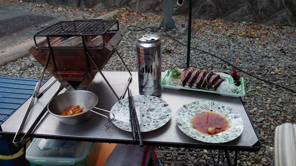 今回は来る途中高崎市内にあるスーパーで買い物をしてきました。カツオのたたきと柿の種でとりあえずプシュッとな( ^_^)/□☆□\(^_^ )