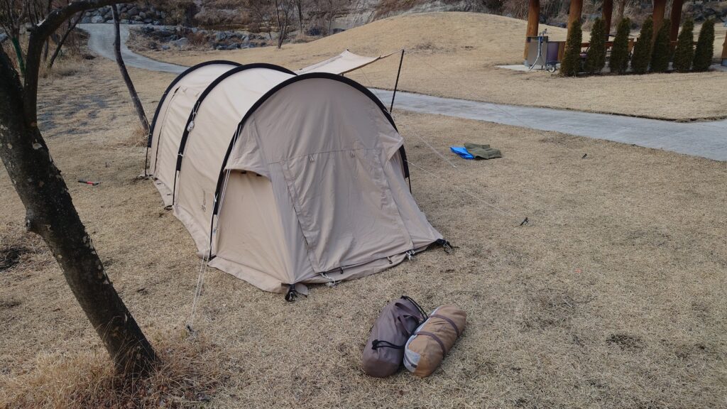 駐車場からあまり遠くまで運ぶのは面倒なので、キャンプ場内の道を通らずに突っ切るとすぐに出入りできる場所に設営しました。