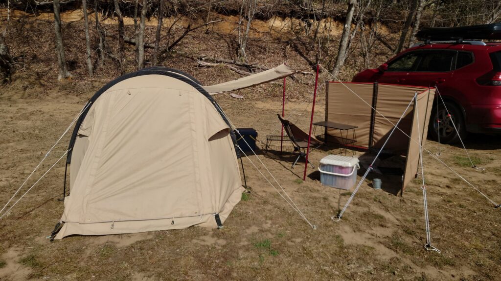 少し迷いましたが、風があるので陣幕miniを張ってみました。