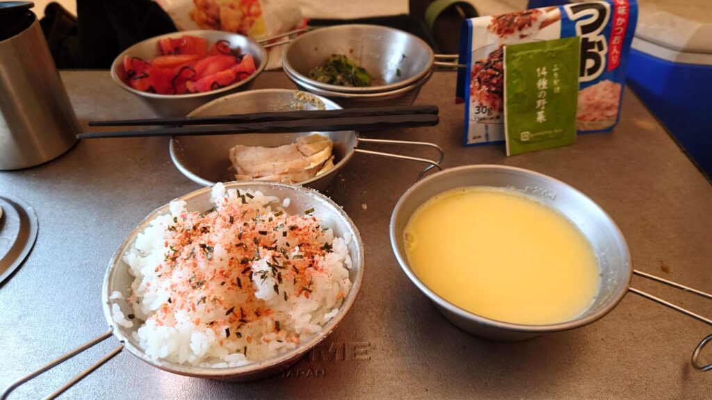 朝食は、シェラカップで炊いたご飯に残り物とふりかけ、カップスープでいただきます。ま、こんなもんでしょ。テントの結露もないので、帰ってのメンテはグランドシートを干すくらいで済みそうです。