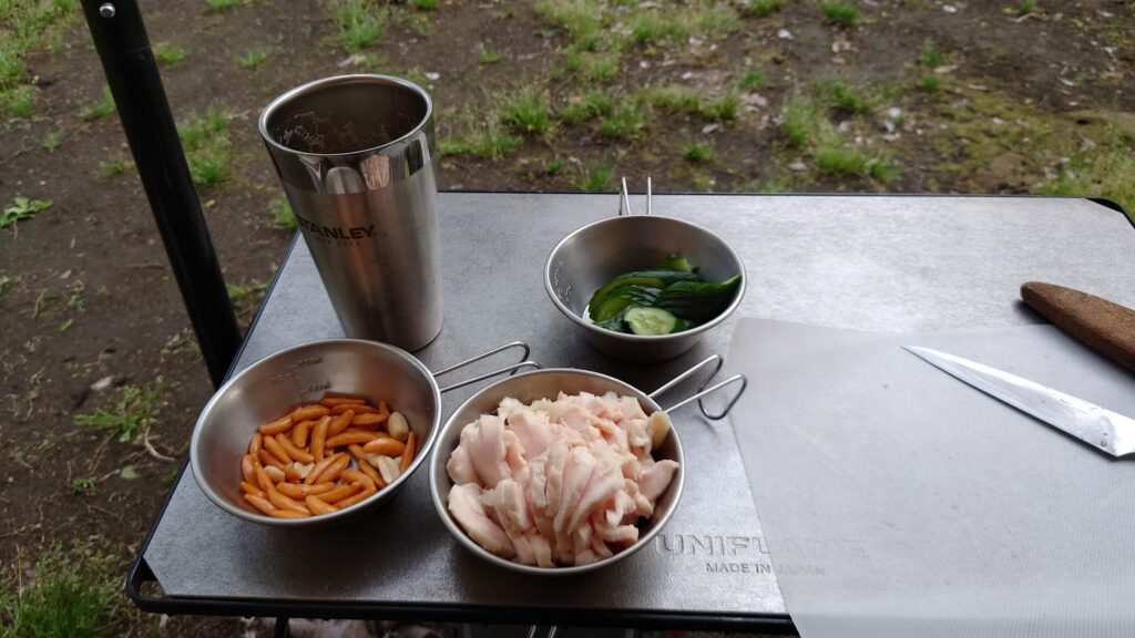ご飯はユニフレームのクッカーで炊きました。味噌汁も具だくさんでインスタントいえど侮れません。缶詰とふりかけをおかずに朝食を済ませ早々に撤収をしました。久しぶりの乾燥撤収ですが、グランドシート裏はびしょびしょでした。