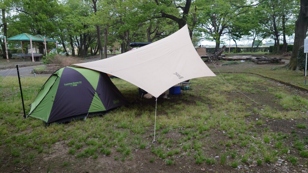 トイレ側に目隠しになるようにタープを低く張りテントと連結するスタイルにしました。