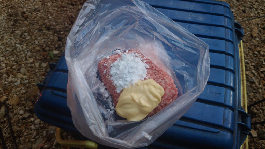 マヨネーズと片栗粉を適当に投入しビニール袋のまま混ぜます。