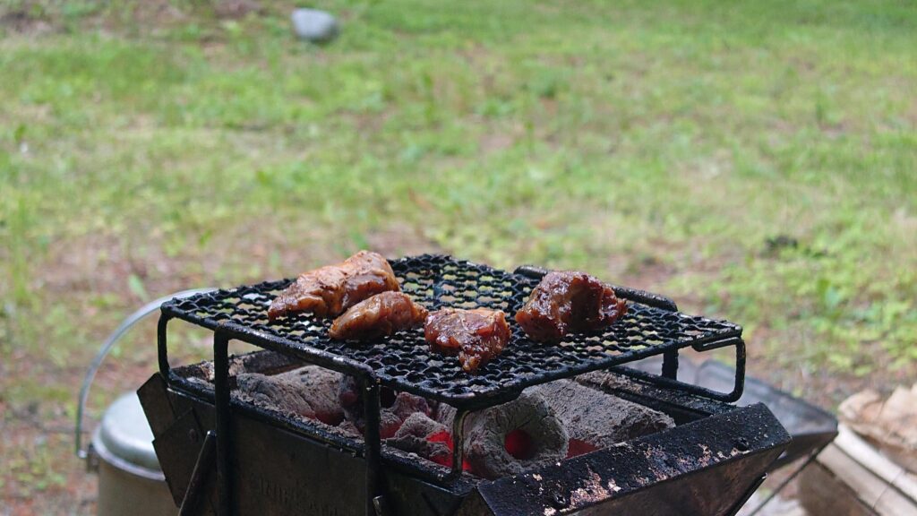 Beisia吾妻店で買ってきたまぐろぶつに、自家製のキュウリの漬物と煮卵を追加です。火起こし器の方は下の方にたまった消し炭でくすぶっていて少し時間がかかりそうです。