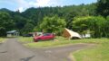 すぐにバンガローが右手に見えてきます。受付はその少し奥にありました。予約時確認したときには、車は荷物搬入時のみ進入可能と言うことでしたが、空いているので乗り入れて好きなところへ設営していいと言われました。入場料1000円とテントサイト利用料が1500円の合計2500円を支払い車で乗り入れます。