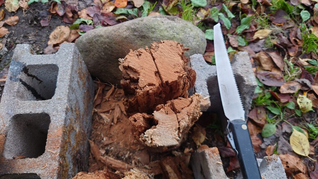 持っていた鋸で切ってみましたが、気がボロボロですぐに切ることができました。それでこの形をみて、スエーデントーチ風に燃やしてやるかと思い、切れ込みを入れようとしましたが・・・