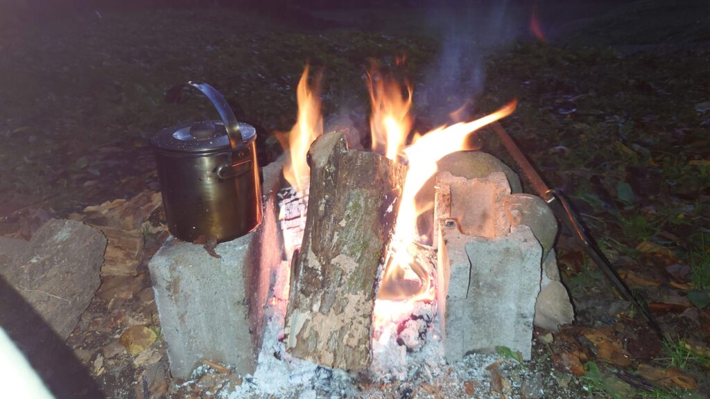 時刻は五時半を回ったところです。既にあたりは真っ暗です。巨大な薪もいい感じに燃えてくれたので、なんとか竈に収めてごとくをのせたいところです。