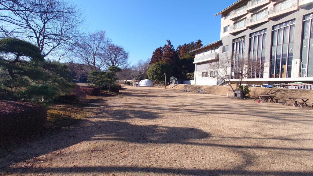 テントサイトがあるのは建物の南側で、奥にある通路の奥です。