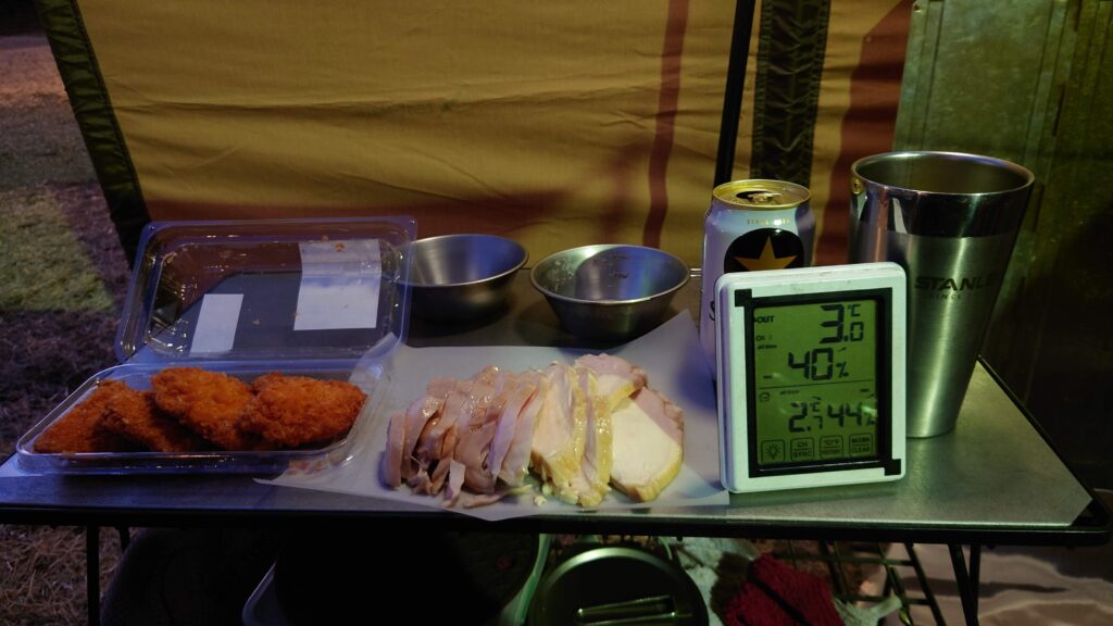 つまみは来る途中のスーパーの惣菜コーナーで買った揚げ物と鶏胸肉です。