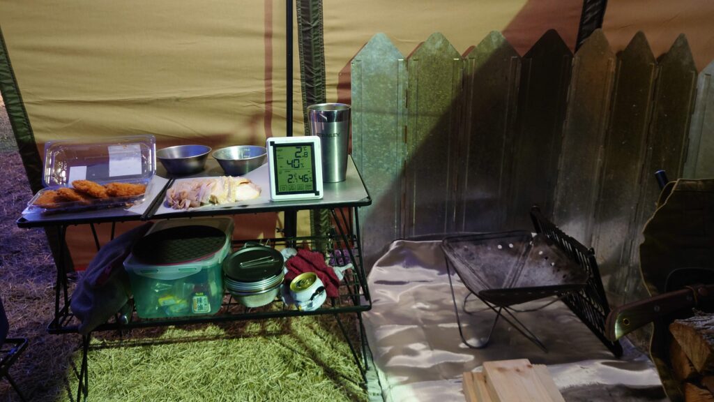 焚火シートを二重に敷いて焚火台を設置します。薪とテーブルを配置すれば準備完了です。