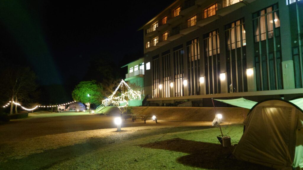 ホテルの庭を利用したキャンプ場と言うことで夜はイルミネーションが点灯します。ソロキャンプのエリアも周りに外灯がありかなり明るくなっています。