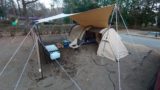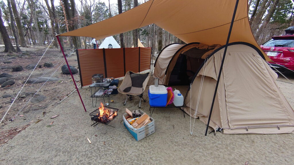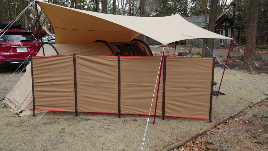 風の方向から、風除け&たき火のスクリーンという使い方が難しかったので、背中からの風を遮るように陣幕miniを一直線に張ってみました。直線だと楽チン^^まあ、いい感じです。