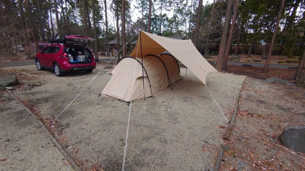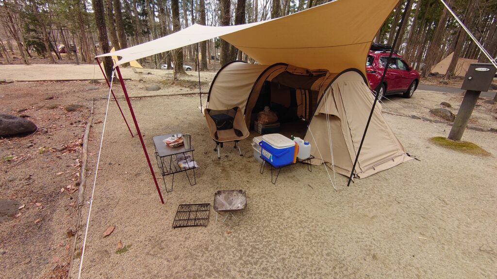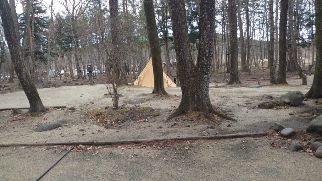 このキャンプ場のテントサイトはきれいに整地されており、テントの設営も容易です。電源もり、サイト間の距離も適度に保たれているので、ご近所さんをそれほど意識せずに好きなレイアウトが出来そうです。