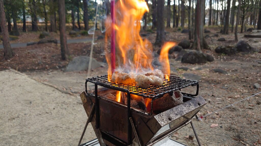 たき火をして、たき火の中に形成備長炭をぶちこんで炭火をおこします。前回の無念を晴らすべく、野外の炭火でしか味わえないであろう肉を焼きます。