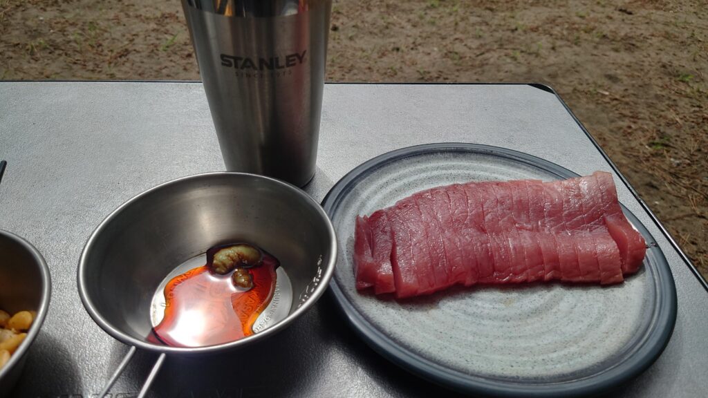 まずは、買ってきたメバチマグロの冊を切っていただきます。これで800円だったかな。一人で食べるには充分すぎる量です。