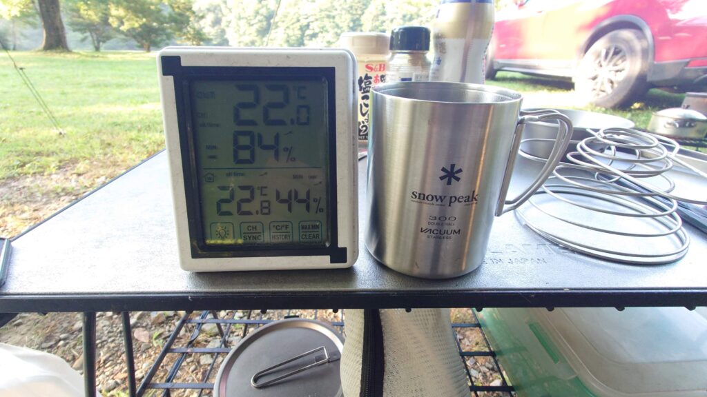 炊いている間に最低気温をチェックしてみます。22℃で夜は気持ちよく眠れました。