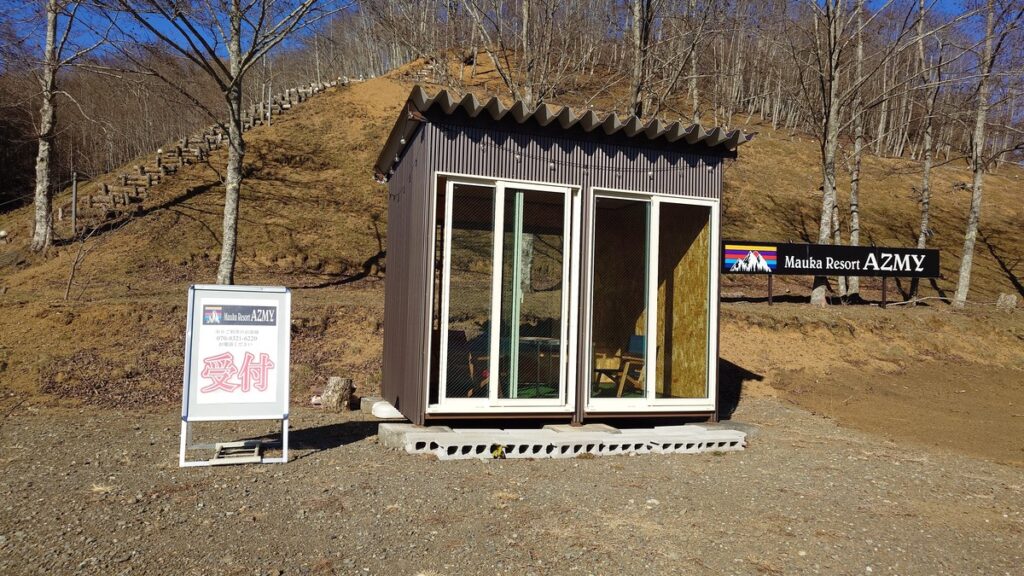 こちらが管理棟です。薪も販売されていますが一束500円だということでした。広葉樹で別に高くはないのですが、キャンペーン中で1月3日までの間、1000円で薪使い放題だとか。二束以上は間違いなく燃やせると思ったので、薪使い放題のプランを利用することにしました。