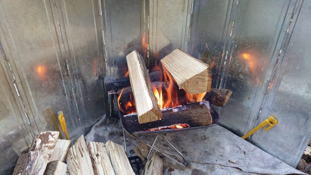 焚き付けは、テントサイト近くに落ちていて小枝などを使い、拾ってきて割った丸太を投入します。一気に温度を上げてから、無料配布されている薪に点火する作戦です。