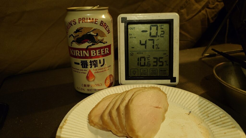 初めの一杯はケーキをつまみに頂きまして、続いては、持ち出しの鶏胸肉のハムを切って行きます。炭をおこせば、肉を焼いたりは出来ますし、大丈夫でしょう。