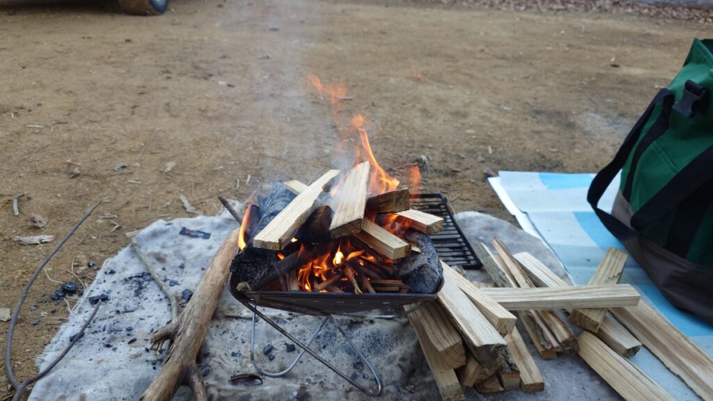 左側の薪というか枝は、サイト周辺に落ちていたものです。灰捨て場にあった燃え残りも拝借してきました。細く割った焚き付けを多めに用意して着火します。着火用に使用するのは一番搾りの包装用のボール紙です。