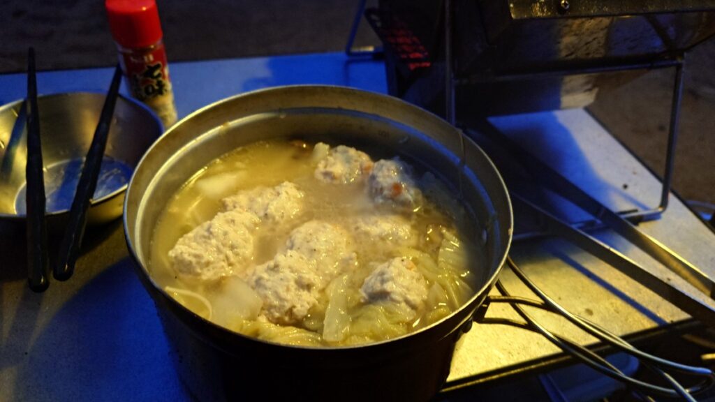 野菜のかさが減ったのでつみれを投入します。火が通ればできあがりです。