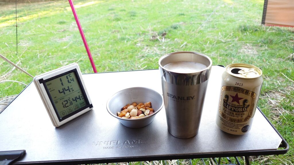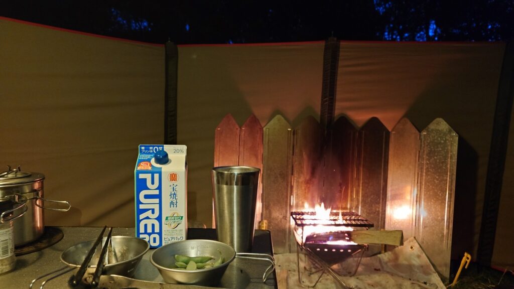 前日は、風も強く、寒さに心が折れて焚火をせずに幕に籠もってしまいましたが、今回は乾杯と同時に焚火スタートです。