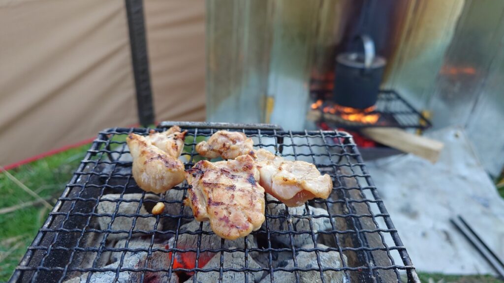 焚火でおこした炭をユニセラminiに詰め替えて炭火焼きスタートです。