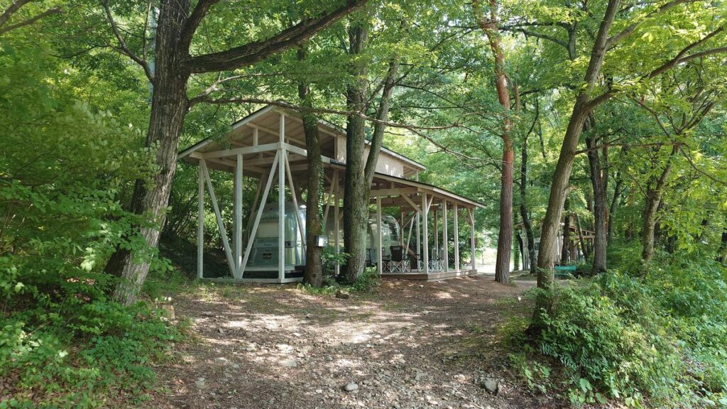 入り口付近の山側には、屋根付きのトレーラハウスやキャビンが並んでいます。