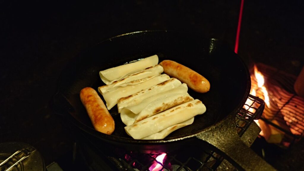 大分終盤になってきました。スキレットでウインナーとチーズを餃子の皮で包んだ物を焼いてつまみにします。この頃には雨が降り出してきていました。強くはありませんが荷物がぬれないようにタープの下に片付けて寝る準備です。午後10時には就寝しました。