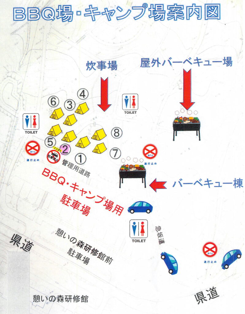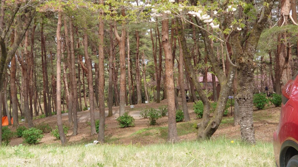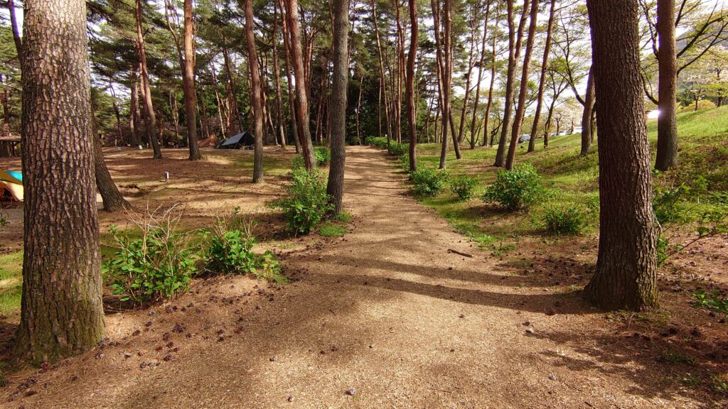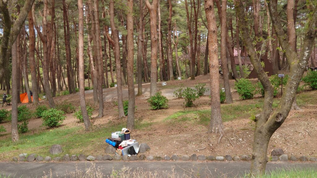 キャンプ場は松林の中で、一応区画されています。受付をしたときにもらった案内図には、①~⑧までのサイトが載っていますが、⑧のサイトのあるところが広場のようになっていて、実際にはもう2~3サイト多いようです。