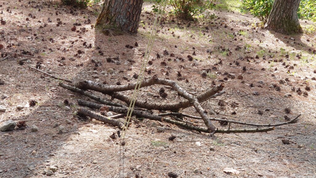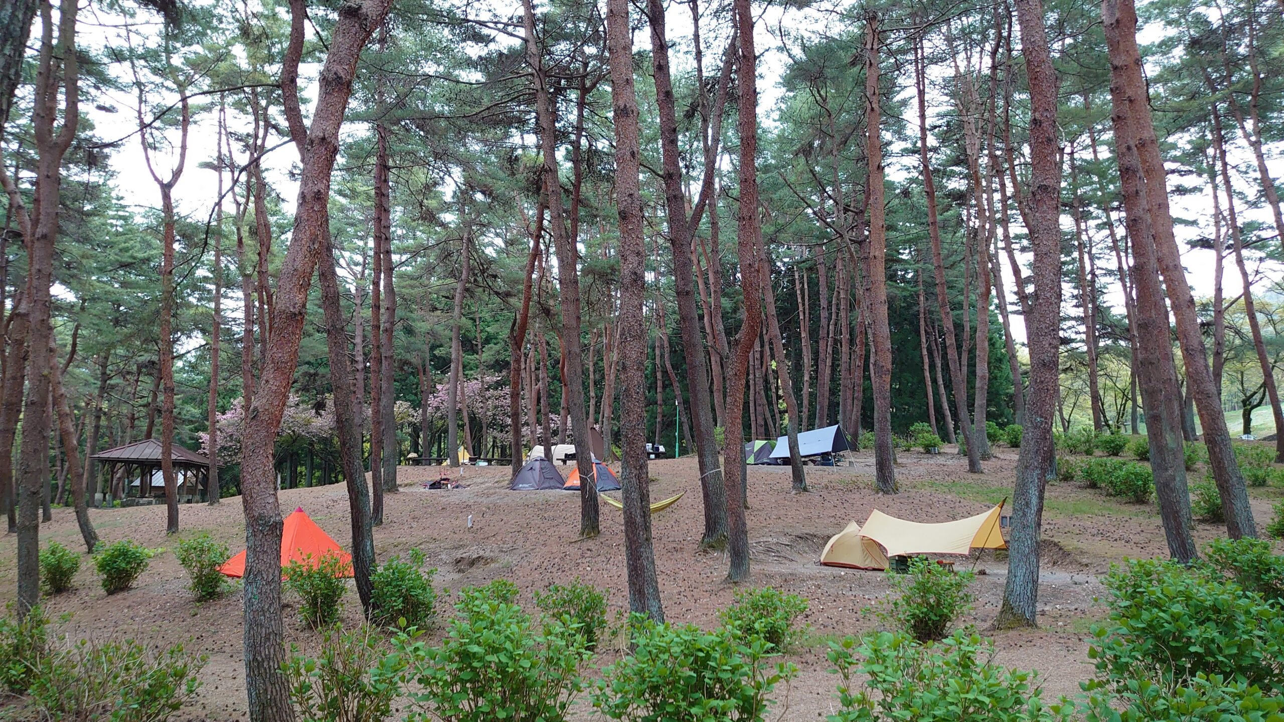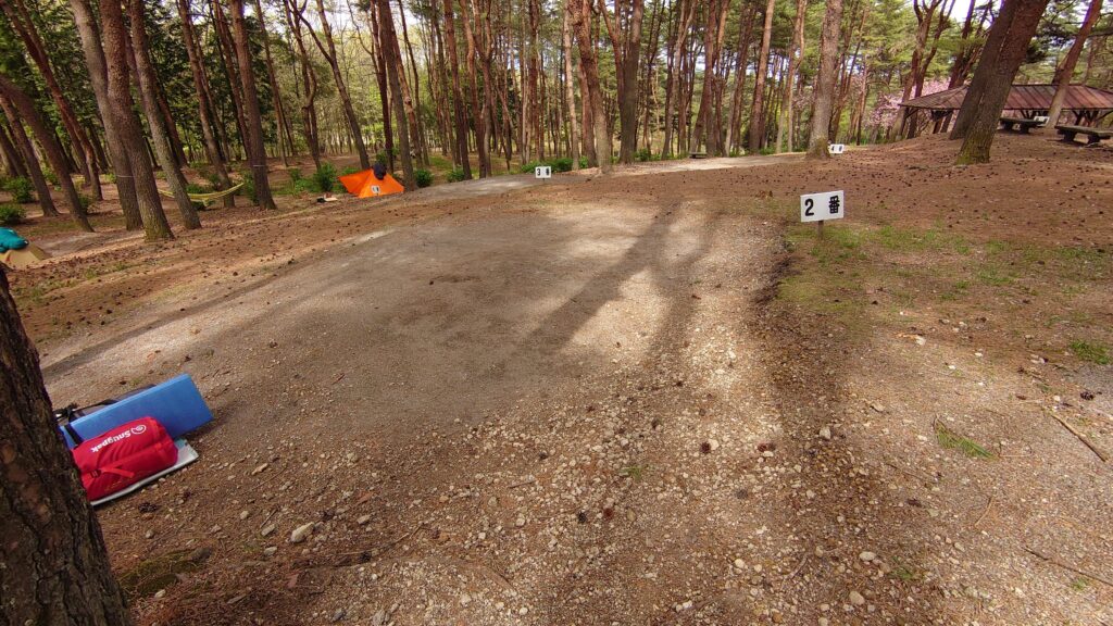 2番サイトです。松林の斜面に平らな面が作ってあります。あまり広くないので、大型のテントやタープを張るのは難しそうです。