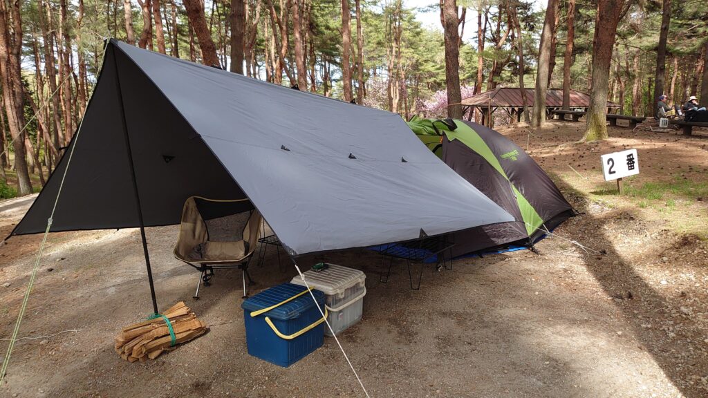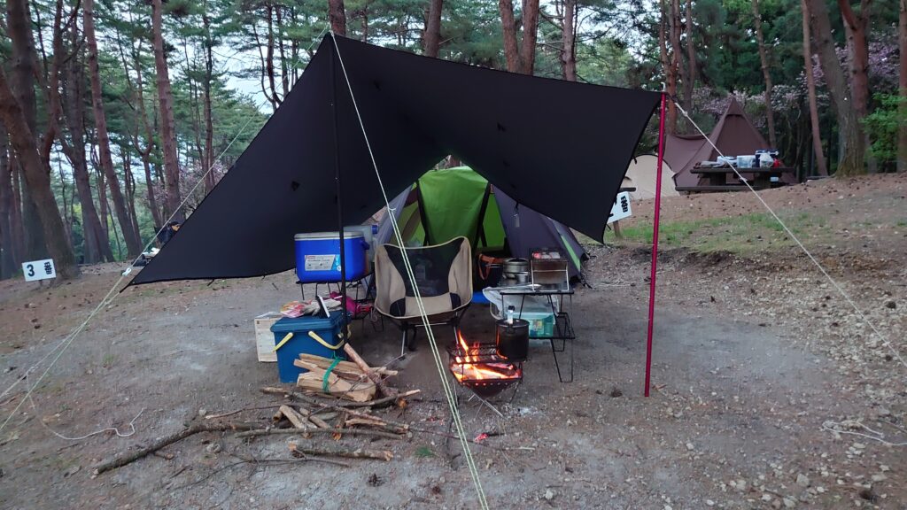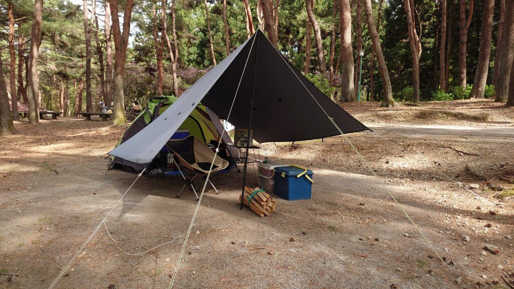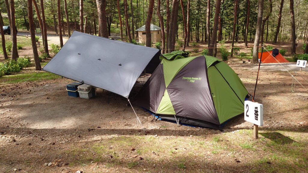 サイトを対角に使って、ツーリングドームSTと男前タープをあわせました。