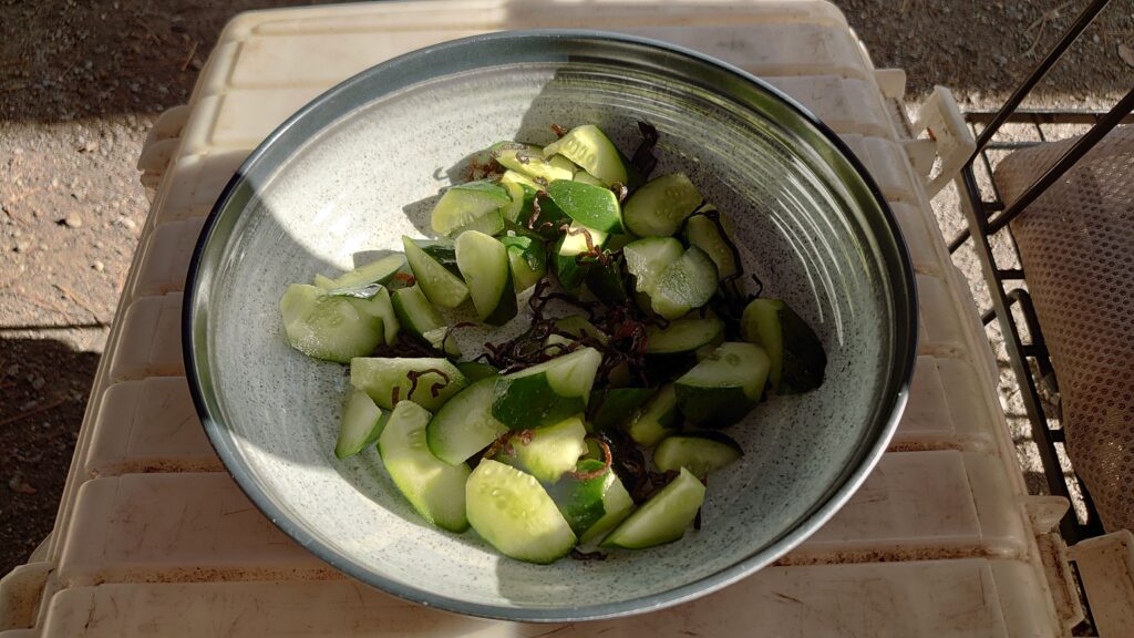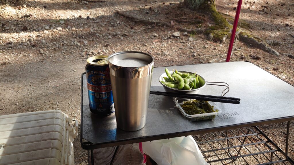 来る途中、渋川のベルクで調達した枝豆とめかぶのパックで口開けです。
