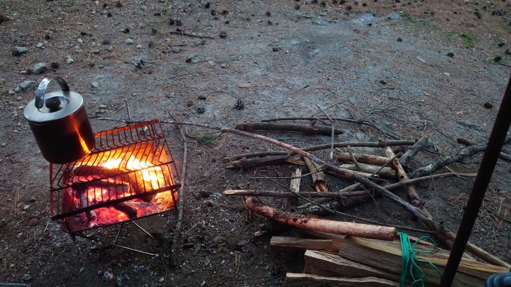 家にあった薪も持ってきていましたが、ここでは、ちょっと歩くと薪には困りません。たき火をしながら、炭に火をうつします。