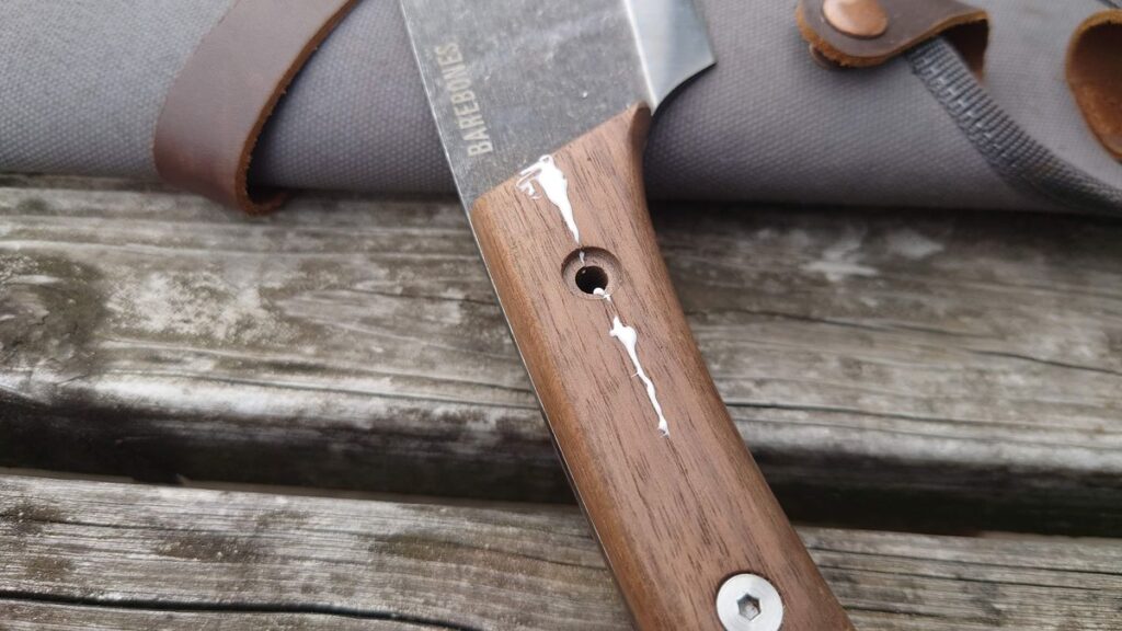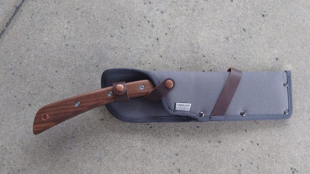 やっぱり、ちょっと格好付けた鉈ですね。そして気に入ったのは、刃がV字型になっている両刃の鉈で、柄の最後まで金属が伸びているフルタング構造です。これなら、刃こぼれ以外どこが壊れるんだという感じです。