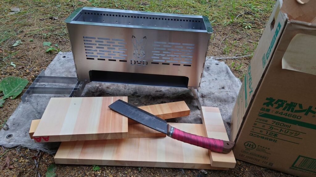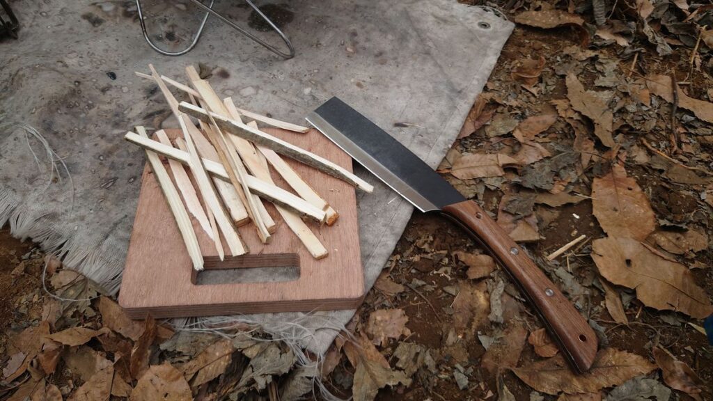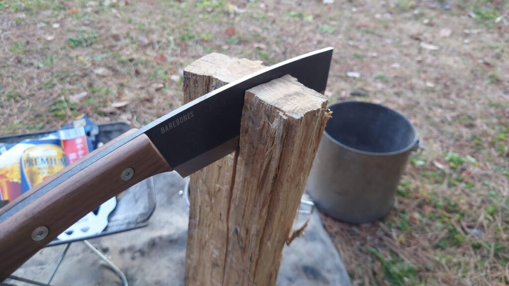 フェザースティックのような物を削り出すには使いづらいですが、薪を細く細かく割れば焚き付けには十分です。