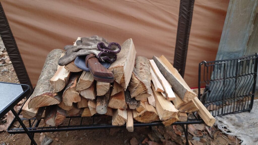 長瀞方面へ出かけたときに、無人薪売り場で購入した建築廃材がメインの薪です。集成材もありますが、このような薪は、まるで野菜を切るようにスパスパ割ることができます。