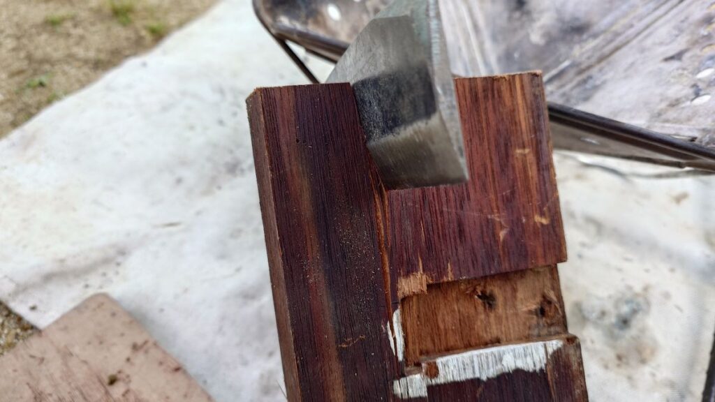 このあたりの薪となるとかなり手強いです。が、諦めず峰をたたき続ければ割ることは可能です。今のところ、峰をたたくのは太めの薪を使っていますが、傷がついたりもしていません。