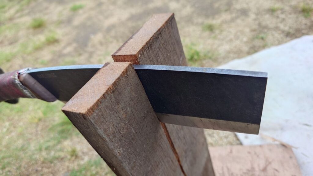 刃先がレの時になっている片刃の鉈での薪を割ったときの様子です。木材の繊維の方向と、鉈の刃が食い込む方向が微妙にずれてしまっています。太めの薪を力尽くで割ろうと、この後刃の峰をたたいていくと、割れる方向と刃の進む方向がずれるので、かなり苦労します。
